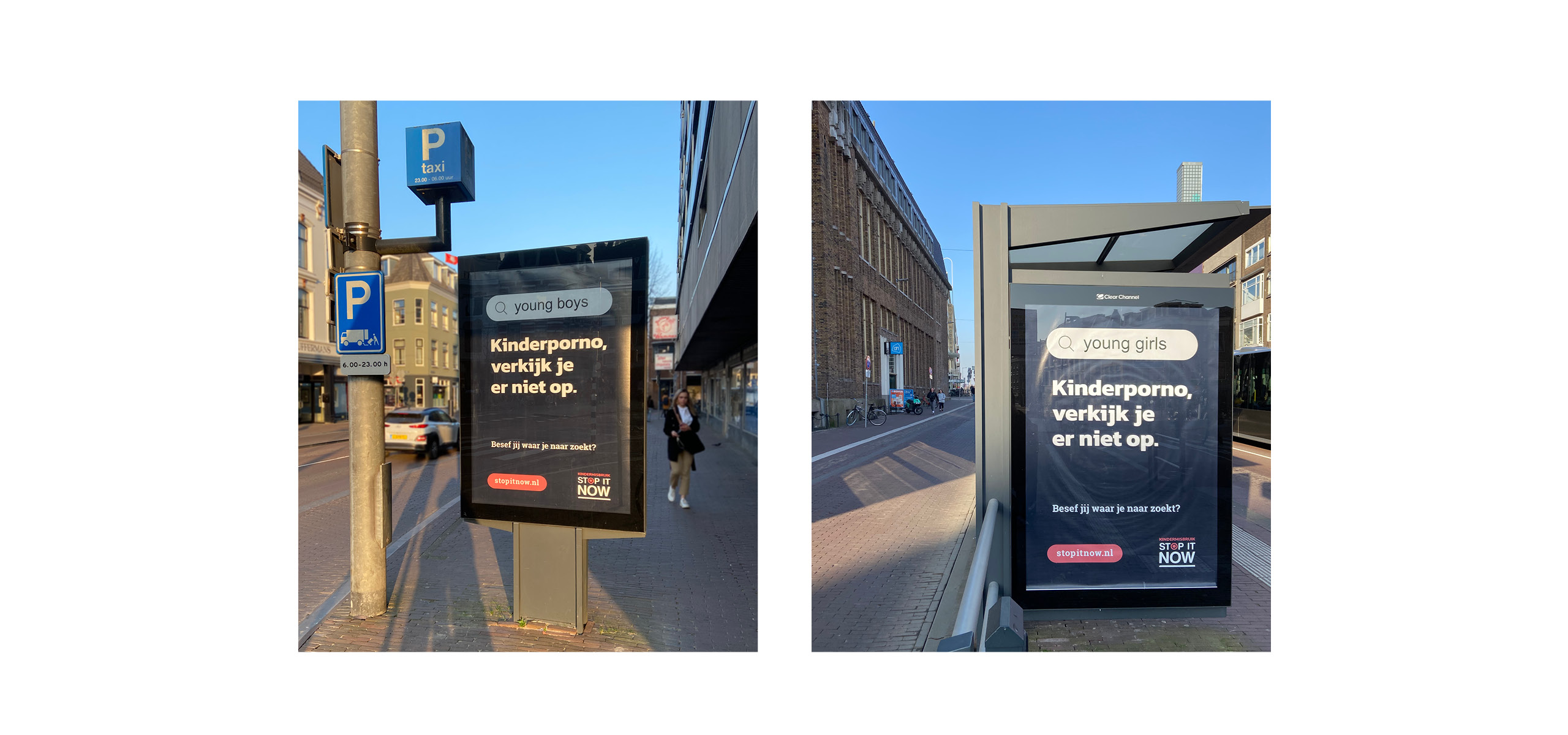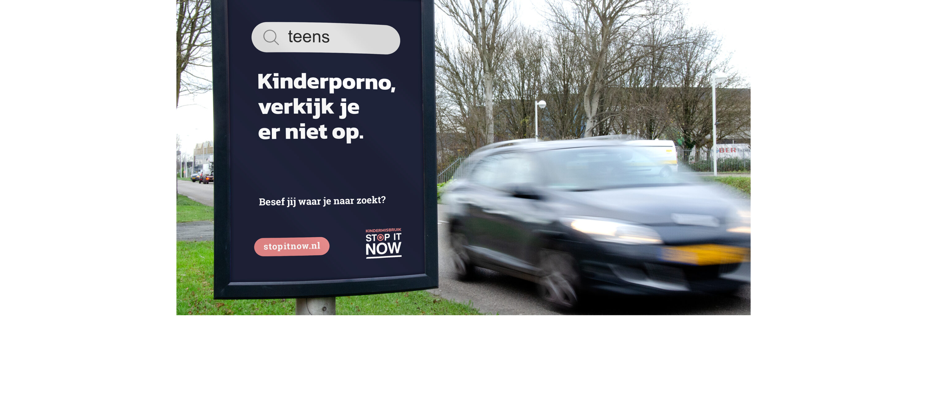 Op zoek naar de campagneboodschap bleek ‘kijken’ het sleutelwoord. Daarmee konden we het ingewikkelde probleem samenvatten in één zinnetje: Kinderporno, verkijk je er niet op. Hiermee doen we een helder beroep op kinderpornokijkers: onderschat de gevolgen van je kijkgedrag niet. We adviseerden Stop it Now ook het woord ‘kindermisbruik’ toe te voegen aan hun logo. Een stuk duidelijker, zo is er geen misverstand meer over wat er nu moet stoppen.