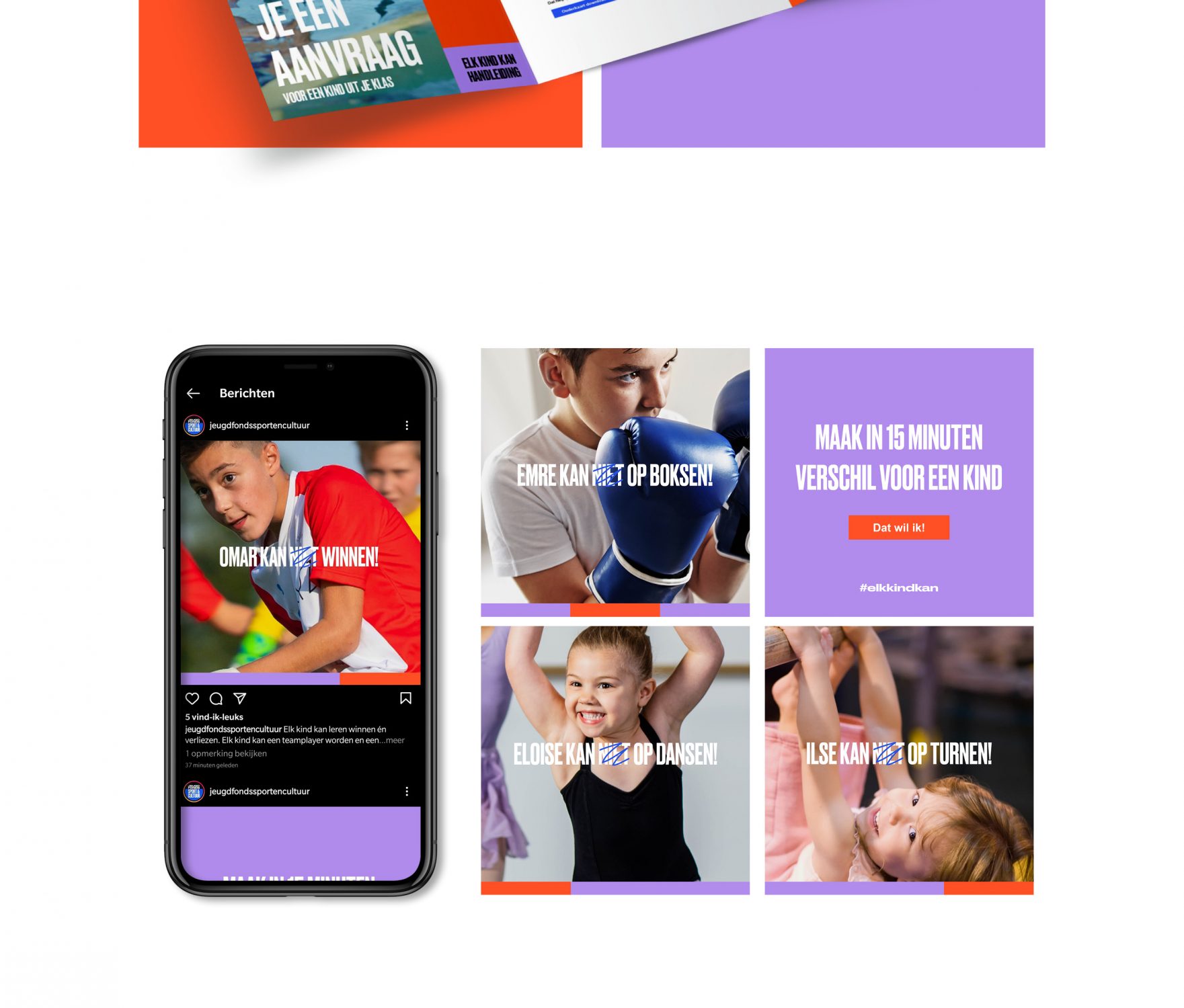 Om te beginnen wilden we graag het communicatieperspectief ‘kantelen’: niet focussen op de armoede, maar op de kansen. Niet op wat niet kan, maar op wat elk kind wél kan – dankzij jeugdfonds. We bedachten een positieve campagneboodschap waarmee we leerkrachten raken in hun intrinsieke motivatie: Elk Kind Kan! Winnen en verliezen, uitblinken en optreden, creatief denken en volhouden, samenwerken en je energie kwijt kunnen, om maar wat te noemen.