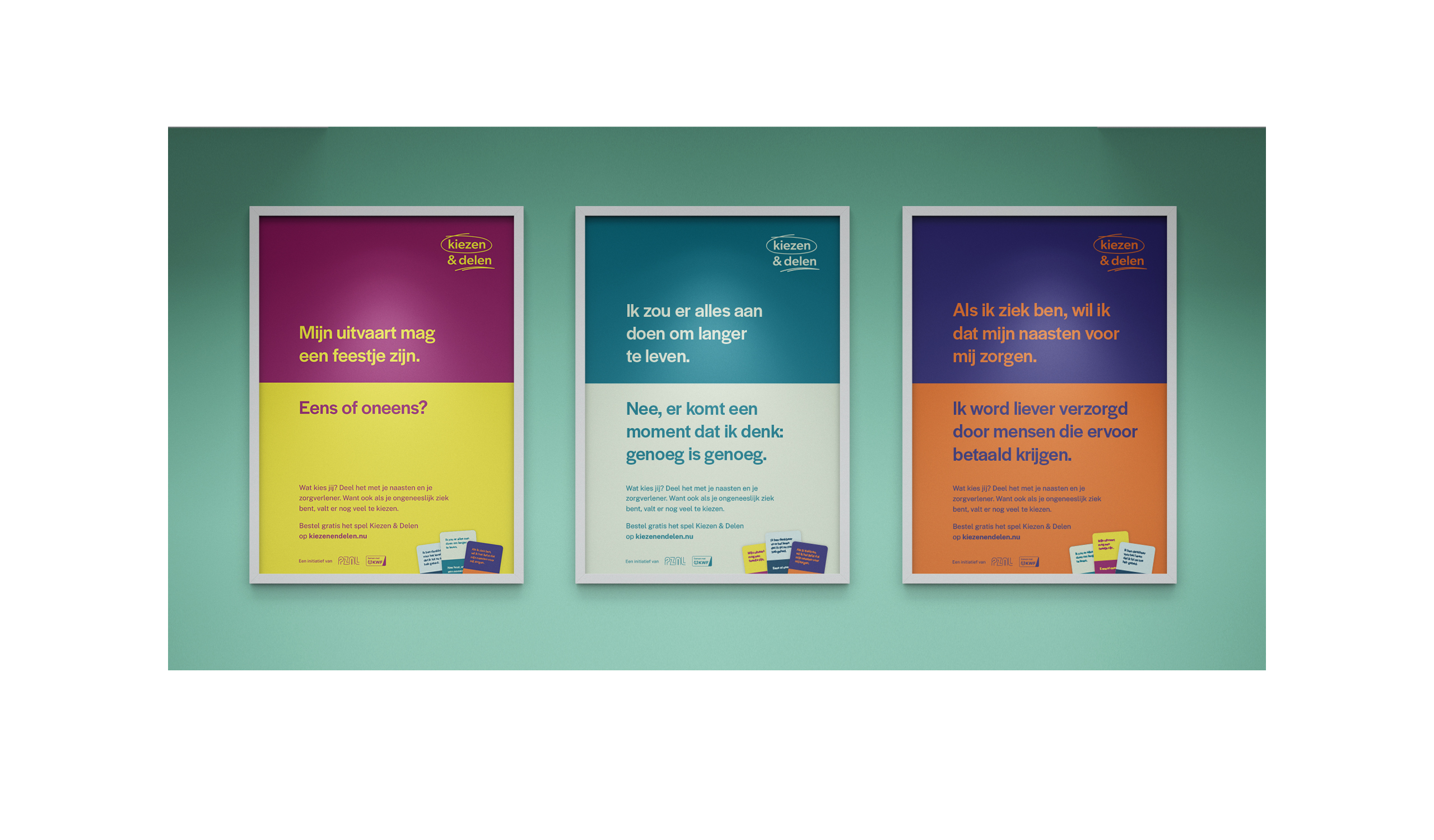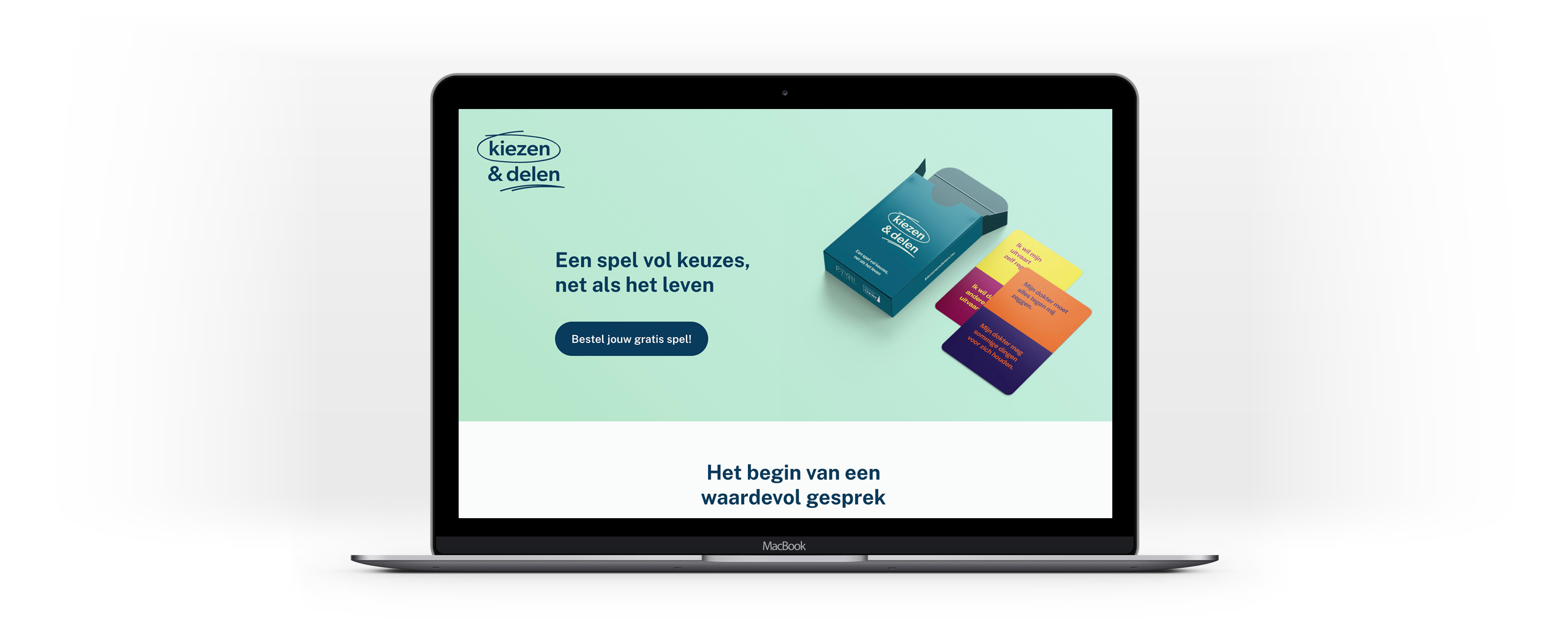 Het spel kreeg de naam Kiezen & Delen. Omdat de palliatieve fase gáát over kiezen en delen. Kiezen hoe je de rest van je leven wilt invullen. En dit delen met je naasten en je zorgverleners. Wel wilden we een bredere doelgroep aanspreken dan alleen (ongeneeslijk) zieke mensen. Want praten over het leven en de dood is voor iedereen zinvol. Of je nou jong, oud, ziek of gezond bent. Bovendien kan je het spel dan echt samen spelen.